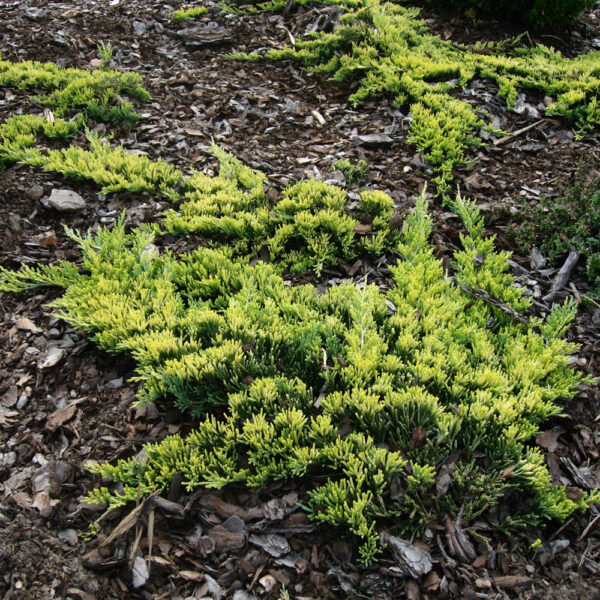 Jedna z najwolniej rosnących, płożących odmian jałowca, dorastająca do ok. 1m szer. Przy ok 10cm wysokości. Igły intensywnie żółte, jesienią przebarwiają się na miedziany aż do fioletowego. Polecany do małych ogrodów, na skarpy, skalniaki a także do donic.