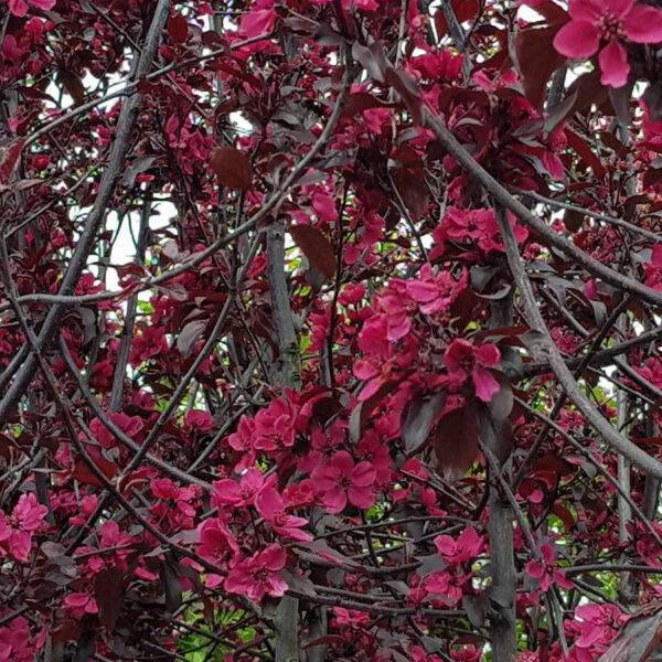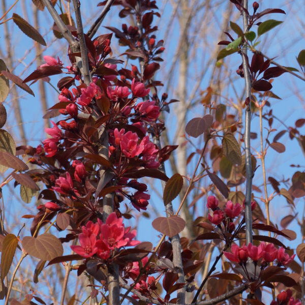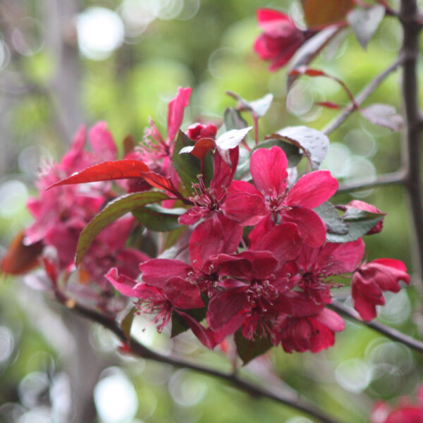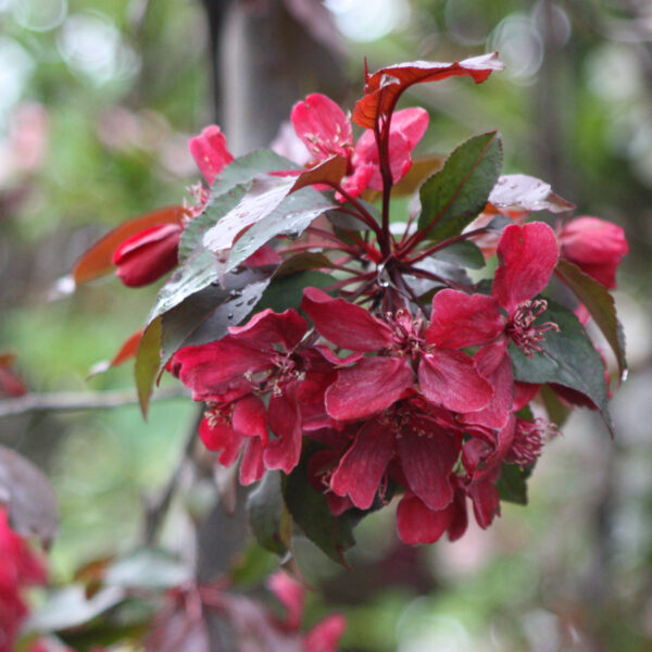 Drzewo o luźnym, stożkowym pokroju, osiągające do około 4-5 m wysokości. Przed rozwojem rubinowoczerwonych, błyszczących liści roślina w okresie maja tworzy liczne, ciemnoczerwone kwiaty. Pora owocowania przypada na czas od sierpnia do października, w której jabłoń zawiązuje ciemnoczerwone, drobne, ozdobne owoce. Drzewo dobrze czuje się na żyznych, umiarkowanie wilgotnych glebach i słonecznym stanowisku. Roślina polecana szczególnie do nasadzeń w przydomowych, małych ogrodach, parkach oraz przestrzeni zieleni osiedlowej.