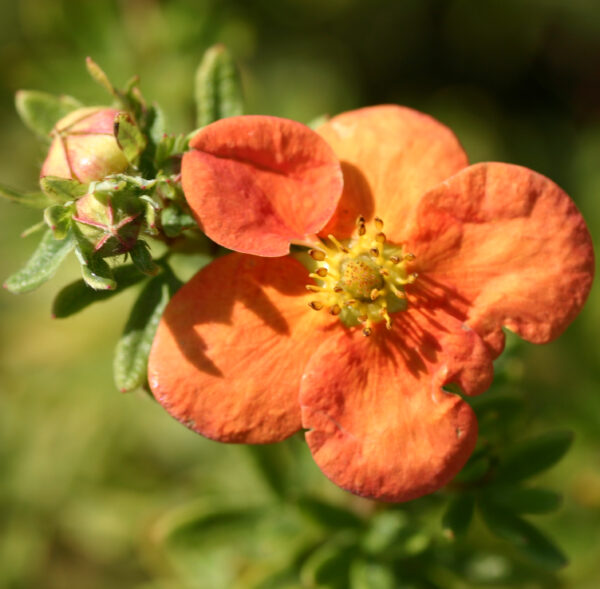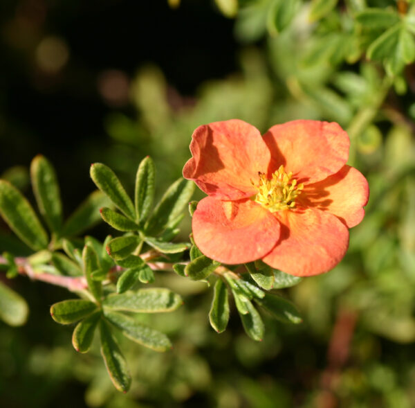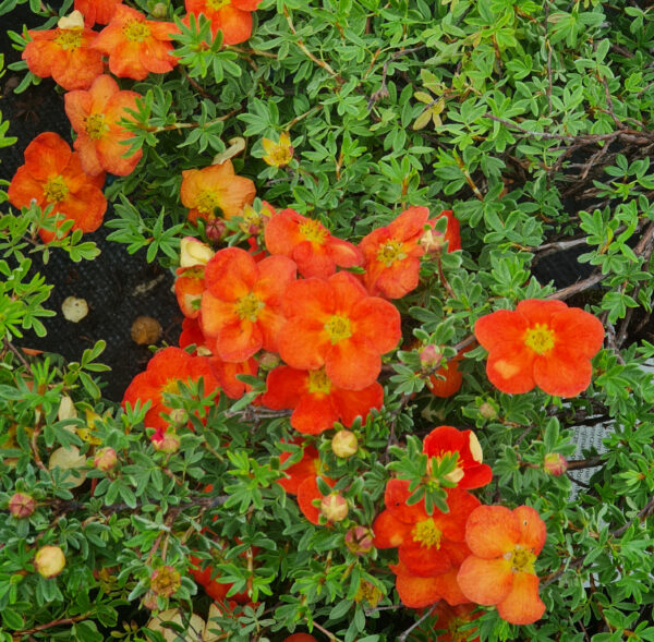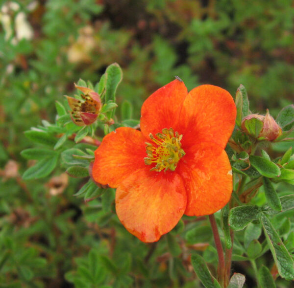 Niewysoki, luźny krzew o płaskokulistym, "poduchowatym" pokroju, osiągający ok 40-60cm średnicy. Liście drobne, pierzaste, jasnozielone, kwiaty pięciopłatkowe, pomarańczowoczerwonym kolorze, pojedyncze, cięcie po przekwitnięciu przyspiesza ponowne kwitnienie. Pięciornik lubi stanowiska czyli słoneczne, o dość suchym, przepuszczalnym podłożu, To doskonała, mało wymagająca roślina na rabaty lub do donic.