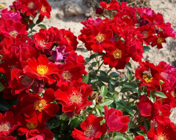 Róże z serii BIENENWEIDE® to odmiany szczególnie intensywnie odwiedzane przez pszczoły. Kwiaty w kolorze ciemnoczerwonym są bardzo bogate w pyłek i nektar, a dzięki pojedynczym płatkom są łatwo dostępne dla owadów. Krzewy są gęste i zwarte, w czasie kwitnienia niemal całkowicie przykryte kwiatami. Wszystkie odmiany są wytrzymałe, kwitną nieprzerwanie od czerwca do późnej jesieni.